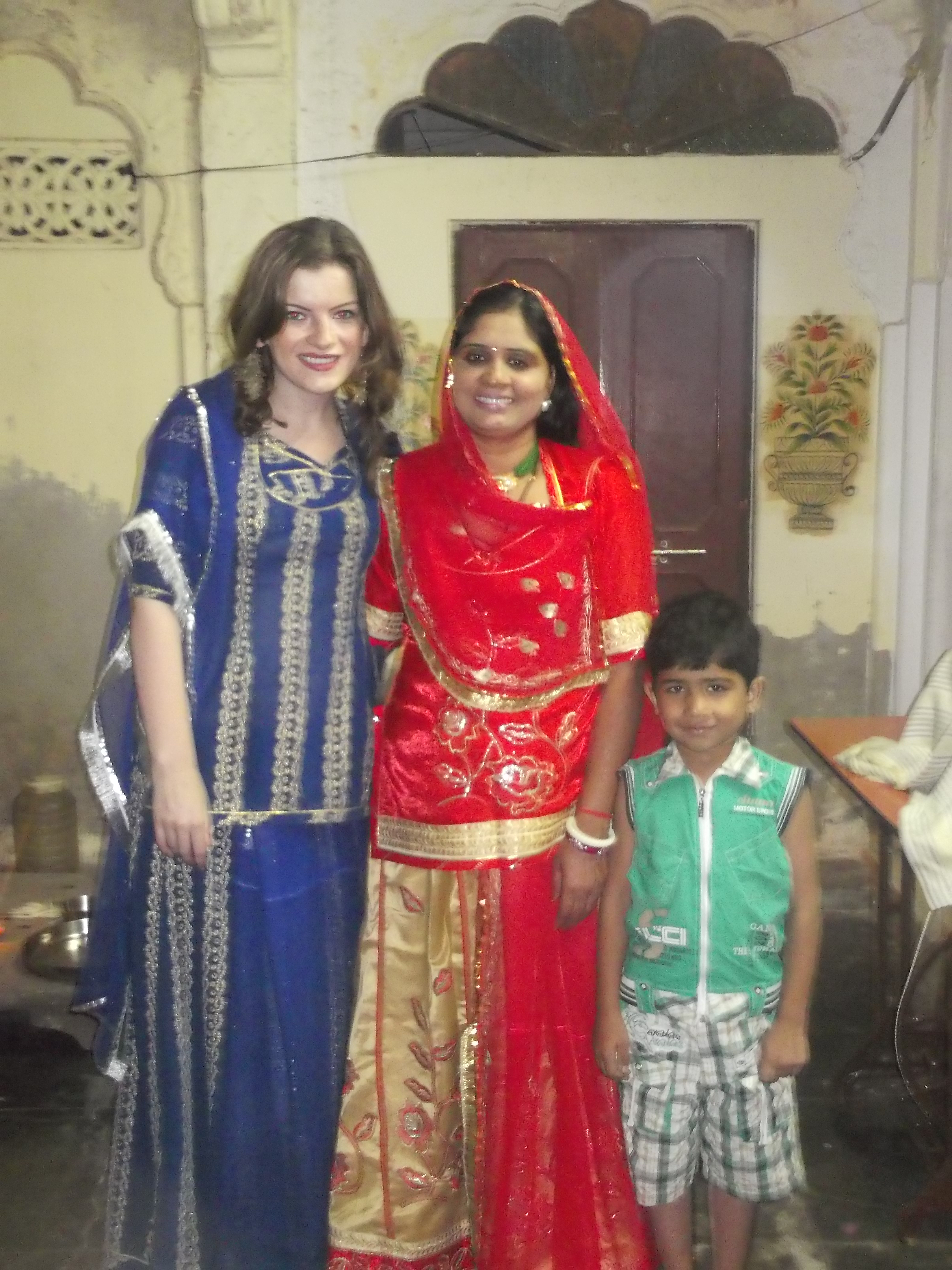 Celebrations began at Achal Niwas, where Manju kindly put me in one of her Rajput dresses. A bit oddly for an Englishwoman, lots of Indian women still dress according to their caste. Manju is Rajput (warrior/royal caste) and hence wears Rajput dresses rather than a saree… you’ll see lots of the Indian women wear their sarees differently according to caste also. Manju loves my skinny jeans, and often laments that she can’t wear them because of her caste! I’m pretty sure that in many places no-one would care, but in Jodhpur at least the Rajput dress is basically like her uniform! There’s also other rules – sarees are for married women, salwar kameez for singles apparently – but I’m super relieved to find out there is such a thing as a ‘ready-made’ saree, there’s hope for clueless white women like me yet! I’ll be purchasing one shortly… 🙂